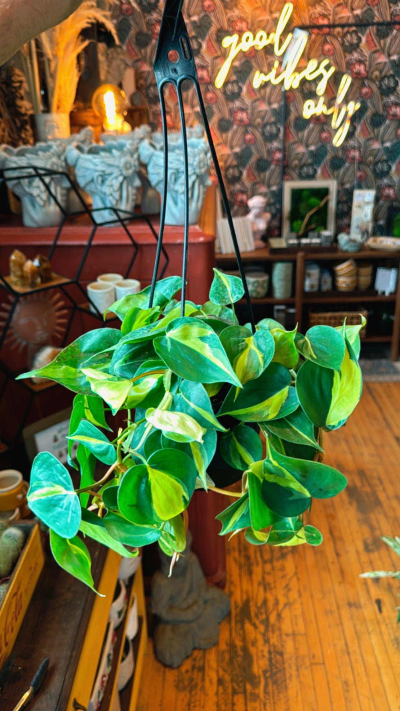 Philodendron hederaceum 'Brasil' is a wild and bold cultivar of the classic Heartleaf Philodendron. Its variegated leaves look almost painted, with strokes of yellow and lime green across the deep green foliage. As if that weren't tropical enough, the stems have pinkish orange hue.
